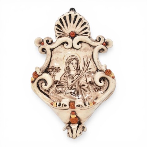 Sei pronto a portare un frammento di luce e devozione divina nella tua casa, un'opera che parla direttamente all'anima? Questa non è una semplice acquasantiera da parete, ma un capolavoro di arte sacra che racchiude secoli di tradizione e fede. Realizzata interamente a mano dai maestri artigiani della ceramica di Caltagirone, questa opera raffigura Santa Lucia, simbolo di luce e speranza. I preziosi dettagli in oro zecchino e lo smalto con effetto madreperla antichizzato donano una profondità e una luminosità uniche, trasformando un oggetto di devozione in un pezzo d'arredo di inestimabile valore. Perfetta per gli appassionati di maioliche siciliane e per chi cerca un oggetto di fede che sia anche un'espressione di altissimo artigianato siciliano.