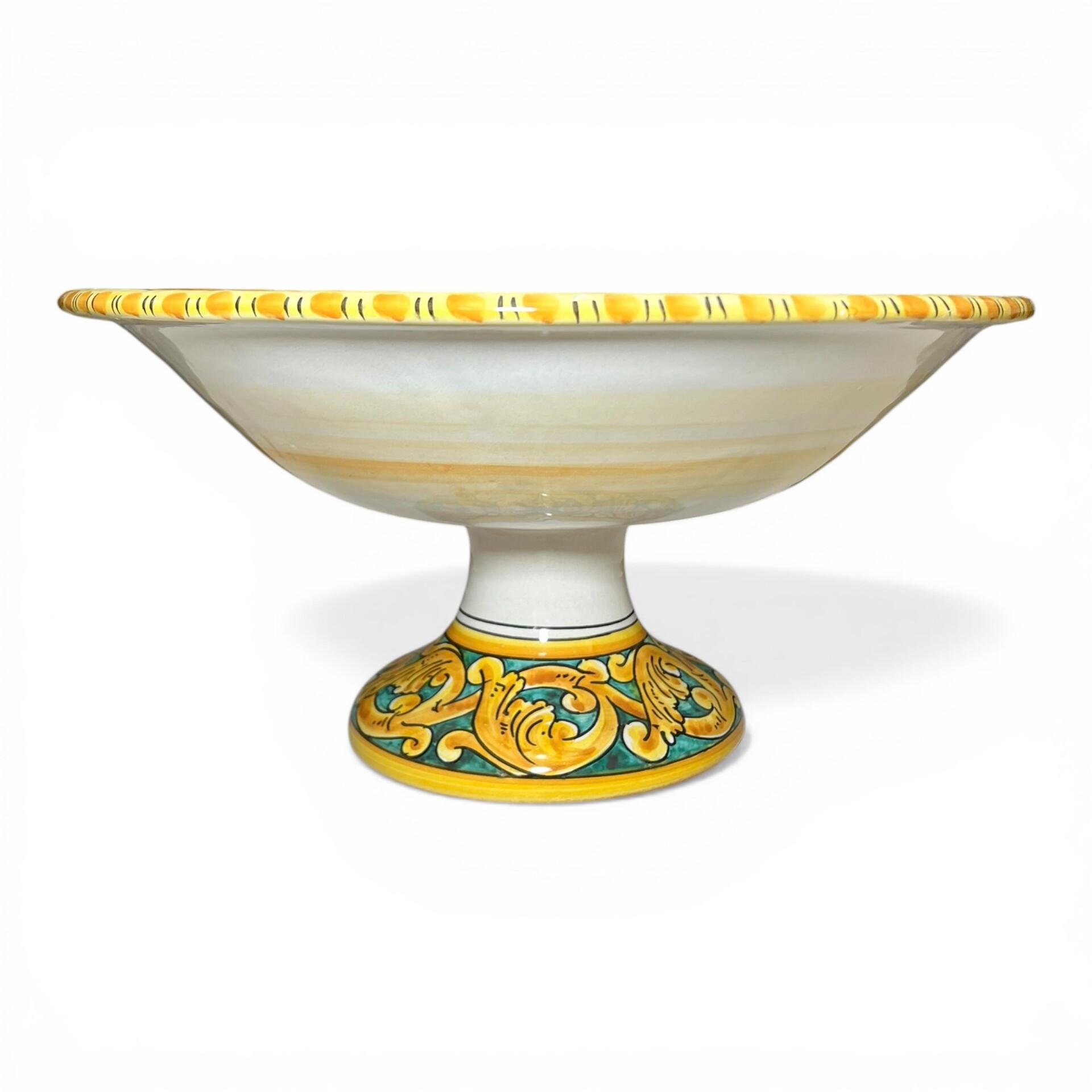 Sei pronto a portare il calore del sole e l'arte della Sicilia al centro della tua casa? Immagina la tua tavola o il tuo soggiorno trasformati da un singolo tocco di maestria. Questo non è un semplice oggetto, ma un capolavoro di artigianato siciliano, un magnifico centrotavola in ceramica siciliana con alzata, realizzato e dipinto a mano dai maestri ceramisti di Santo Stefano di Camastra. Il suo vibrante decoro ornato giallo su un profondo fondo verde cattura l'essenza del Mediterraneo, portando luce e prestigio in ogni ambiente. Perfetto come portafrutta in ceramica o come pezzo forte del tuo arredamento, questo centrotavola è un'autentica espressione delle maioliche siciliane, un investimento in bellezza e tradizione che non passerà mai inosservato.